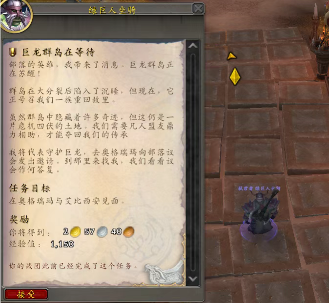 进入游戏后,我们自动接到巨龙群岛任务,我们需要做1分钟的任务获得66金币,不然购买坐骑的金币不够。