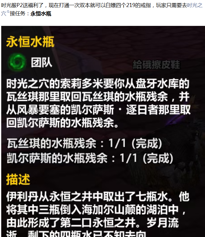 需要注意的是我们要做的任务不是游览时光之穴,不少玩家坐着龙下来以为是这个任务还在一直做,这个任务是之前版本的开门任务,不是我们的戒指任务哦!我们做完永恒水瓶任务后直接去找NPC索莉多米交任务就可以从他那里接到后续给戒指的任务了,戒指拿错了也没关系,直接找NPC买其他属性的戒指就行了。