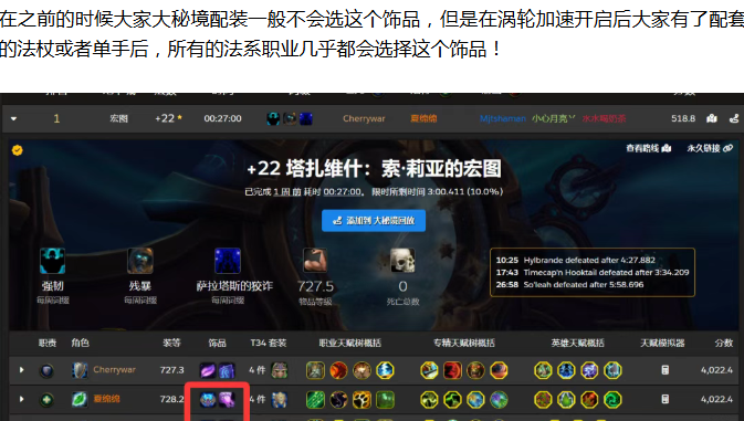 如图所示,现在冲层的法系基本上都会带这个饰品,不管是治疗职业奶德、奶萨还是输出职业元素萨、奥法,只要能凑出套装效果基本上都会选择这个饰品为常驻饰品,所以大家如果是能凑出套装属性的法系,一定不要错过这个饰品,确实是现在最强的被动饰品了!