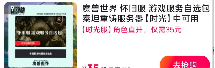 时光服直升只要35R,看到这个画面的时候玩家都是楞了一下,都在怀疑是BUG,因为正常的直升起码也要298。就算有打折也是打8折之类,但是一下子降低到35R真的有点不敢相信,这是在某音上的魔兽官网出售的礼包,但是当你点进去看的时候就不是这个画面, 只能说这一波真的是被雷火给秀到了。