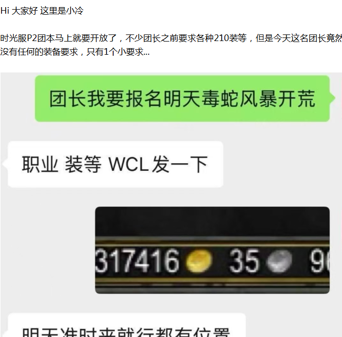 看到玩家背包里的金币,团长也就不关心其职业装等和WCL了...