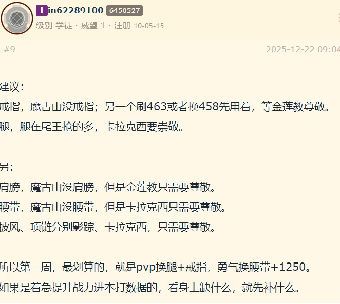 魔兽世界“熊猫人之谜”怀旧服目前可以竞技场混分轻松获得4000征服点数,然后去找军需官兑换483的PVP装。因为MOP的PVP属性不占装等,所以483的PVP装和483的PVE装是一样的。除了单手职业可以换武器外,其他职业只能换其他部位。有玩家总结了本CD征服点数兑换优先级,大家可以参考: