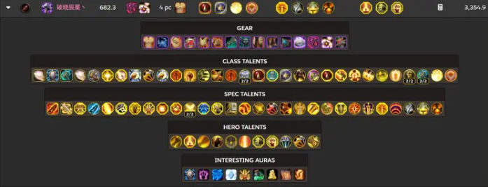 我们可以进一步研究一下惩戒骑的天赋和配装,装等682.3,武器使用最上顶,饰品是纸牌屋和起搏器,属性暴击>精通>急速,这些都算是常规配置。
