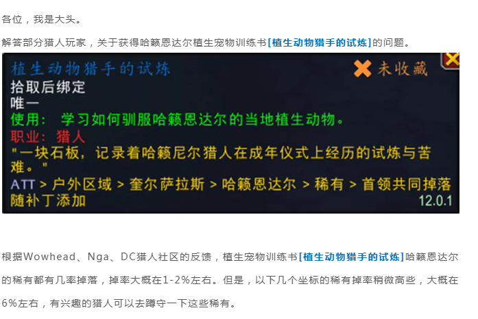 魔兽世界:猎人植生宠物训练书,这5只稀有掉率高一些