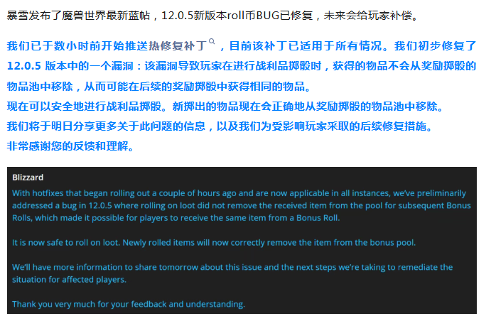 暴雪蓝帖:新版本roll币BUG已修复,未来会给玩家补偿!
