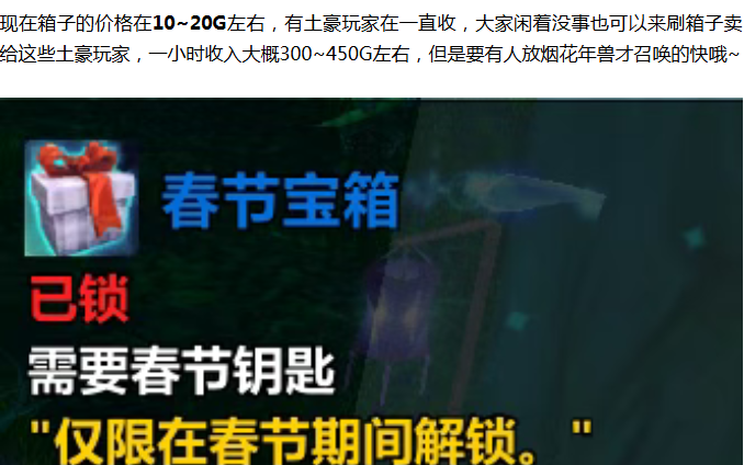 因为春节宝箱可以无限刷,估计后面会被GZS刷成很低的价格,大家想要来刷金的可以早点来,刷箱子的收益虽然不是很高,但是可以上班挂机摸鱼的时候顺便刷,还是挺舒服的。