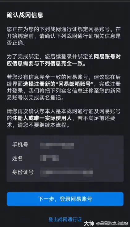 e、确认需要绑定的战网通行证信息,点击下一步,登录网易账号