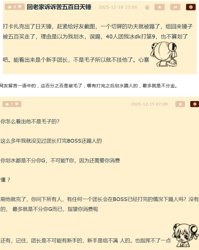 魔兽世界玩家在NGA发帖说自己去打卡扎克团,结果拍卖的时候被团长踢了,组回去之后日天锤已经被500G拍掉了。团长的理由是该玩家划水,他觉得团长是个新手不是毛子就不挂他了。