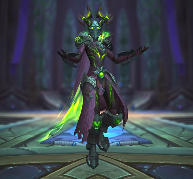 这套装备外观以暗绿色邪能能量为主调,肩甲散发符文流光,气场拉满,