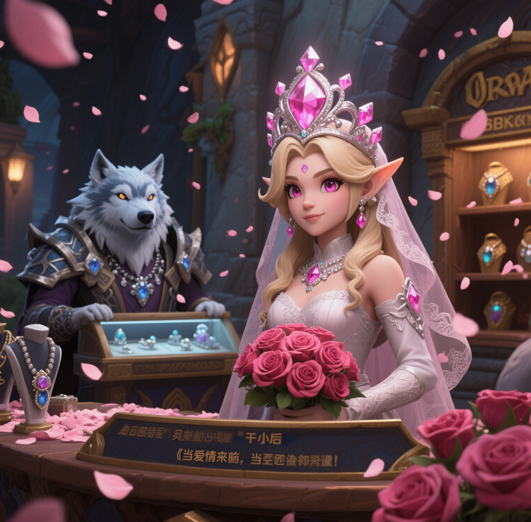三个月后,「奥格瑞玛」银行新增了NPC「霜狼珠宝商」,头顶永恒粉钻冠冕的新娘建模,分明是小悠的游戏角色。点击NPC会播放全服广播:「当爱情来临,艾泽拉斯也会下玫瑰雨」。