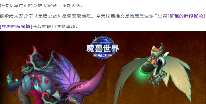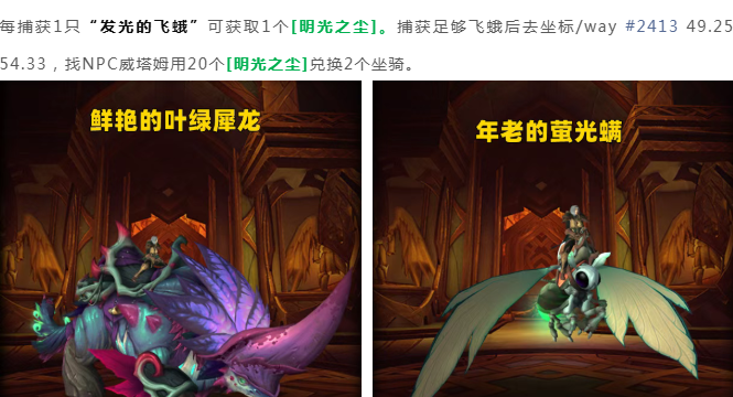 魔兽世界:至暗之夜坐骑“鲜艳的叶绿犀龙、年老的萤光螨”获取前瞻,这2个坐骑也要时间堆