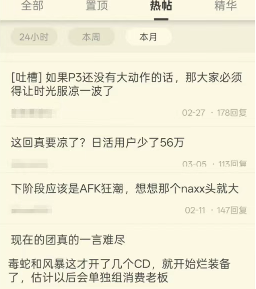 可能雷火一直没有放出P3方面的爆料,所以这短时间论坛出现了很多唱衰时光服的言论。而且都是热度靠前的热帖,但是有意思的是根据第三方数据统计,这几天时光服的活跃人数依旧破百万,这个数据和凉一点都不沾边,而且没到晚上的时候热门大区都会出现排队的情况。所以说凉的估计都是向快点开P3的那部分玩家,因为这段时间真的有点无聊了。