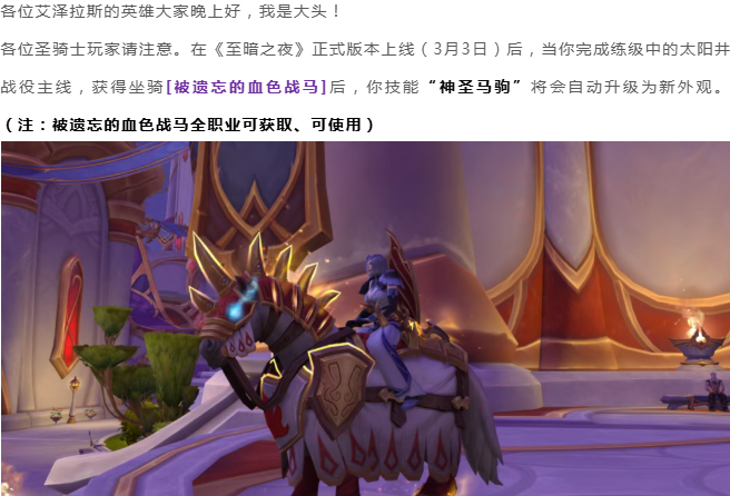 替换后的“神圣马驹”光影效果、粒子效果明显,尤其是在在周围颜色较暗的情况下更明显,各位圣骑士玩家有福了。