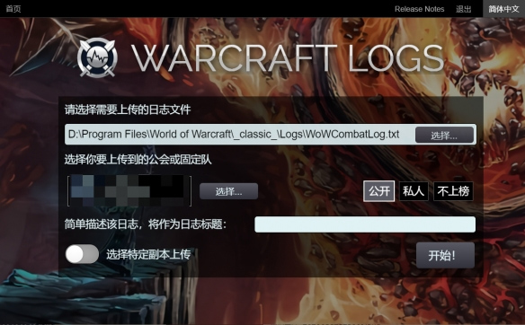 5、在我们打完一次副本后,就可以打开先前安装的wcl上传工具,登录后选择对应服务器上传日志,日志位置在魔兽世界根目录下的logs文件夹,名称是wowcombatlog。点击开始,等待进度条完成,数据就被上传到wcl网站了。