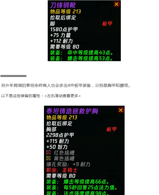 板甲装备包括6件泰坦余烬商人出售的PVE装备,分别是3件鞋子和3件护腕,护腕是装备绑定,可交易。