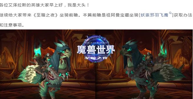 魔兽世界:至暗之夜坐骑“妖祟邪羽飞鹰”获取前瞻,依旧需要“4+4”打怪