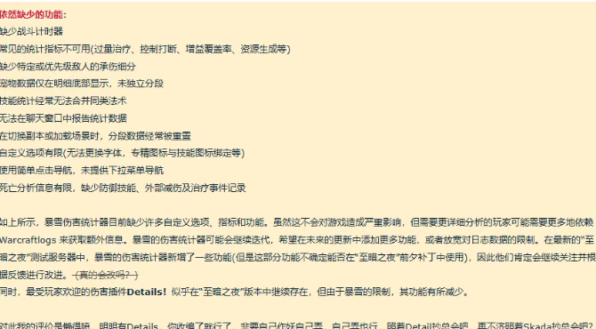至暗之夜前夕版本开始之后,大部分的外部功能插件将会被禁止,主推的是暴雪的内置插件,但是根据测试结果效果并不是很理想。最为明显的就是连基础的战斗计时器过量治疗、控制打断、增益覆盖率、资源生成等等都没有,具体的如上图。