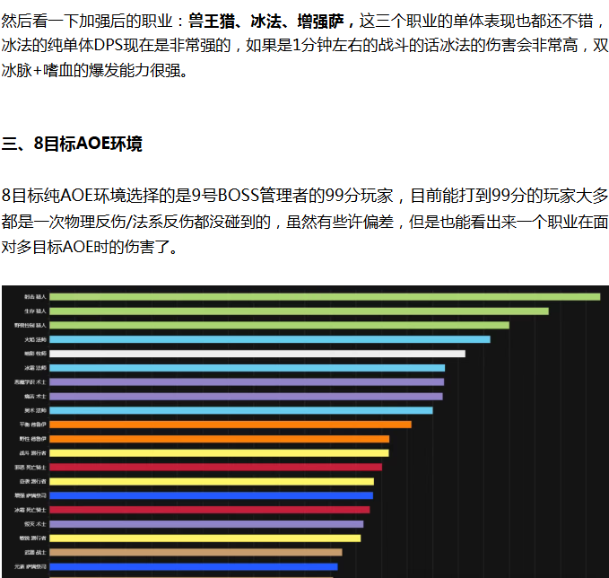 排名前三的职业里除了老牌强势职业生存猎和痛苦术外还有一个被官方新增强的兽王猎,兽王猎在加强后直接一飞冲天,AOE单体两开花,直接超过了生存猎,在吃了官方的一次削弱后依然可以登顶MC,在MC里是表现的最好的DPS职业,综合素质很强,不论是单体还是AOE表现都非常出色。