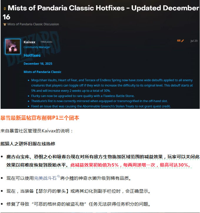 魔兽世界“熊猫人之谜”怀旧服在16日开放了潘达利亚,给玩家短短2天的练级时间后,周四(18日)就要开放第一个团队副本魔古山宝库了。然而暴雪就在今天又发布了一个怀旧服的蓝帖,并宣布对P1的三个团本进行削弱。