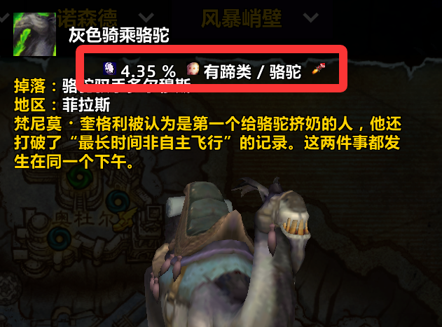 今天来看一下玩家分享的获取这四款野外坐骑的故事迷失、磷光、骆驼、紫乌鸦,这四款坐骑是野外坐骑,有大量的gzs在蹲,普通玩家很难获取,所以根据插件统计也是魔兽最稀有的几款坐骑了!