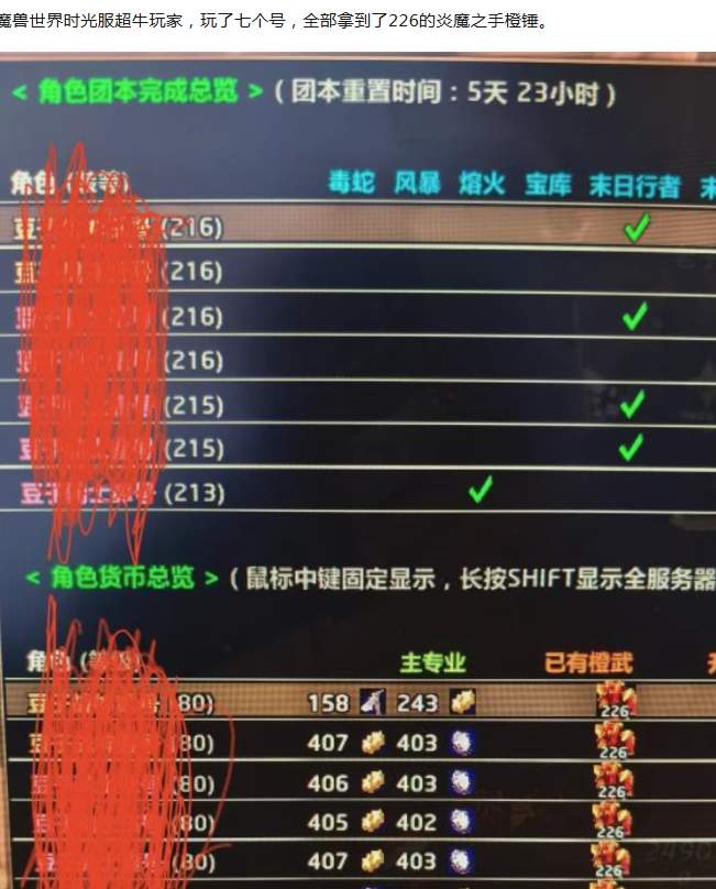 魔兽时光服超牛玩家:7个号全部拿到了226橙锤!