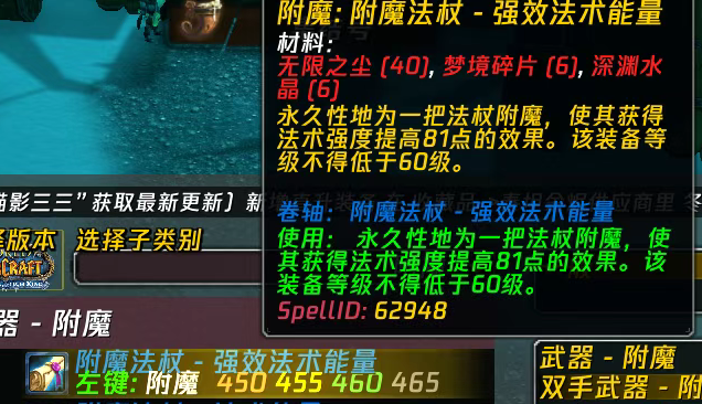 不过在WLK框架内,这种法系双手锤非常坑,无法附魔81点法强。关键在于WLK原本并没有法系双手锤,所以81法强的附魔设定为法杖专属。实际上现在这个附魔应该改成“附魔双手武器 - 强效法术能量”了。