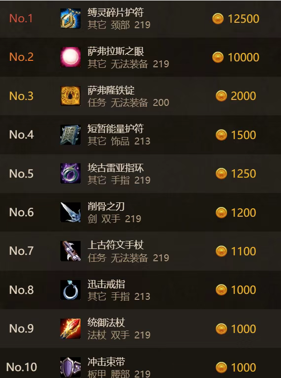 魔兽世界泰坦重铸时光服最新物价排名,缚灵碎片护符依旧排在第一位。橙锤的两件道具分别是第2和第3,短暂能量护符、埃古雷亚指环、削骨之刃等极品散件和武器也排在前面。
