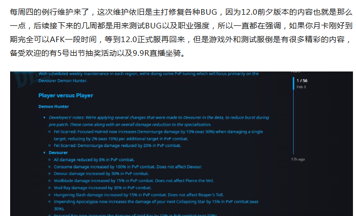 当然这些基本上都是消费,但是12.0测试服的内容倒是和全体玩家都相关,尤其是职业平衡方面。12.0测试服版本将于2月23号关闭测试,这也就意味着到时候12.0前夕版本的职业强度正式落下帷幕。不过在4号的时候暴雪公布了新一轮的大改,不出意外的话这将会是倒数第2次大概,在关闭前还有一次改动,这样的话那些A级强度的职业基本上是稳了,因为太过于锋芒的话肯定会被削,只有处于中间部分才是最稳的。