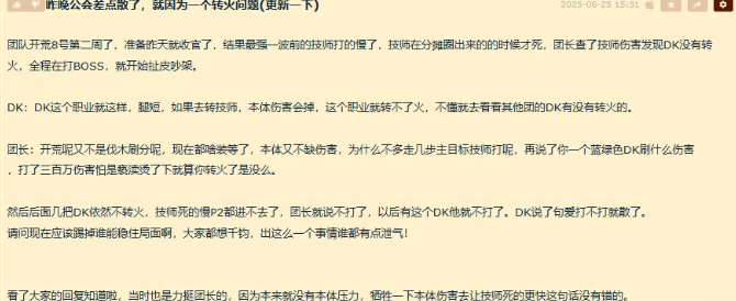 一个转火就可以把整个团都给搞解散,这就是近期论坛非常火的一个瓜。团长在复盘分析的时候发现了队里的DK没有转火一直打BOSS,于是在群里说了这件事,结果直接吵起来了,后面几把的时候DK依旧没有转火,团长就放狠话有这个DK就不打了,最后闹得不欢而散