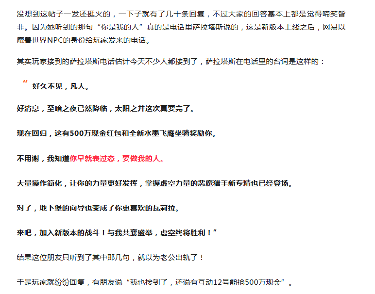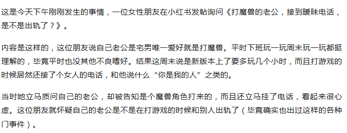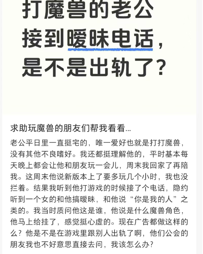 老公打魔兽收到暧昧女生电话,老婆发帖求助,怀疑其出轨公会女玩家,结局亮了