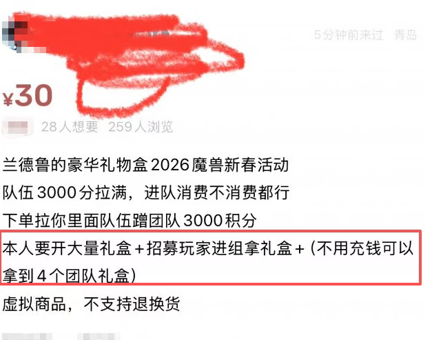今天的兰德鲁礼盒和去年一样开出来的坐骑全部都可以交易,所以就有很多大佬想通过开礼盒卖坐骑,于是就卖位置不用充值也能拿到4个团队礼盒。对于这个看法玩家出现了不同的意见,有玩家认为应该绑定就可以绝对交易,但是一旦绑定可能很多大佬都不会入手,不少大佬是奔着可交易去的