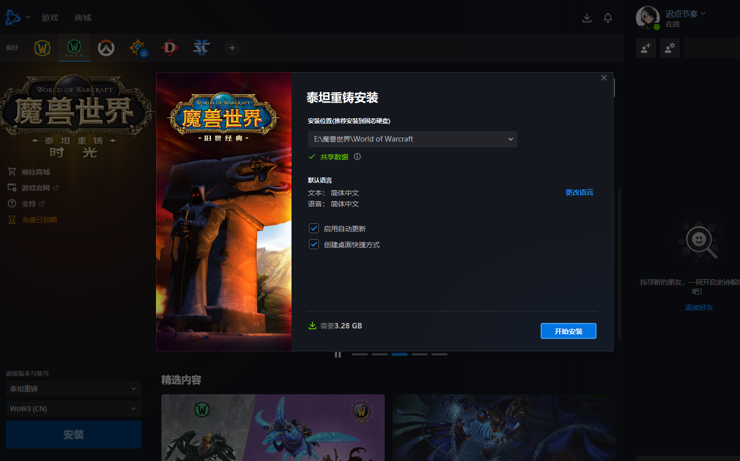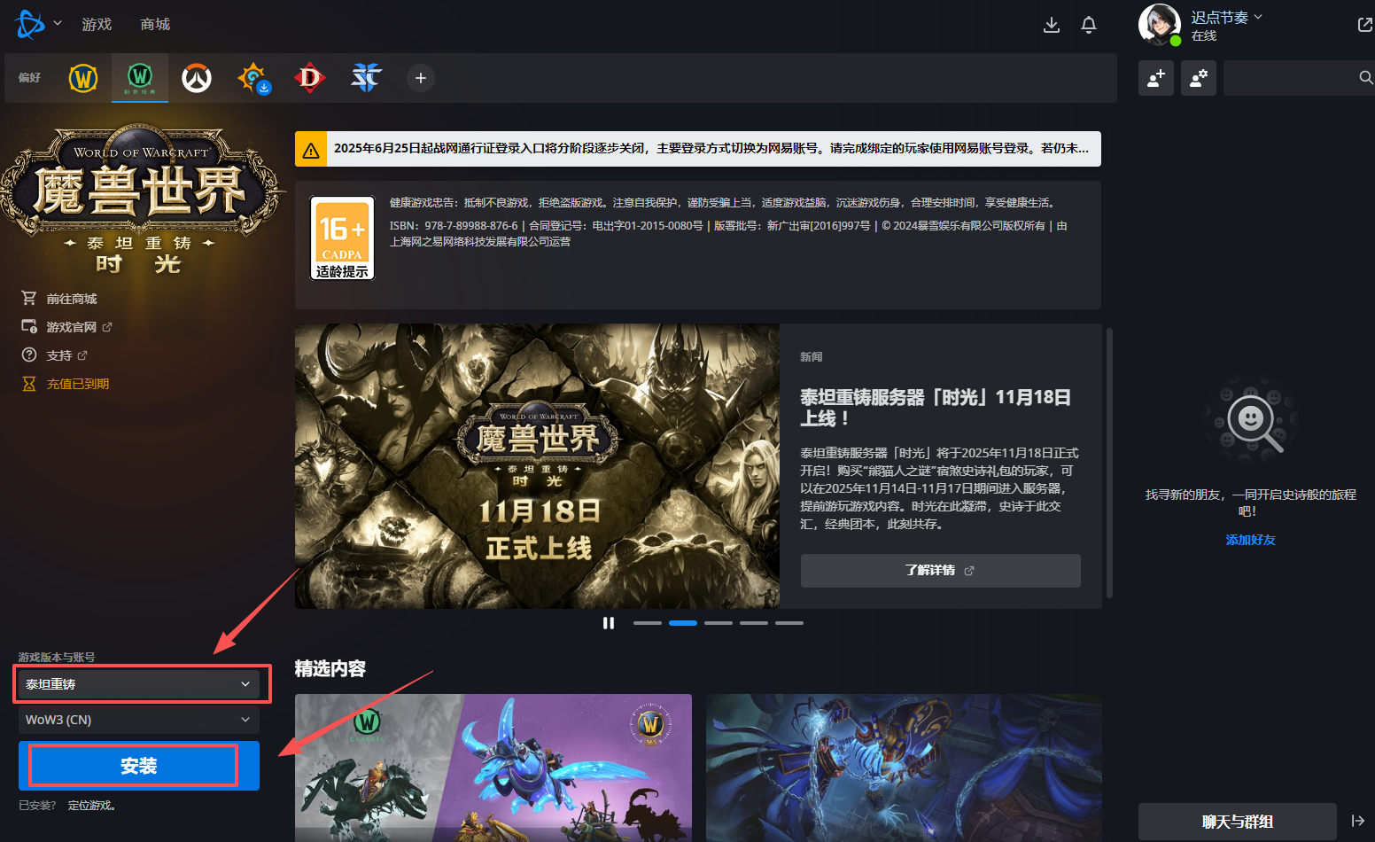 很多新手玩家第一步就搞错了!请注意,时光服(World of Warcraft: Classic) 与我们现在玩的正式服(Retail)是两个独立的客户端,绝对不能混用。请严格按照以下步骤操作: