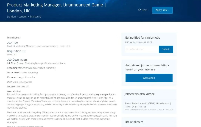 暴雪在2025年11月发布了一款尚未公布的游戏的产品营销经理职位,而发布内容非常耐人寻味。这是一份从2026年1月开始为期6个月的合同,这立刻引发了一个问题:究竟是什么游戏需要这么早就准备好?