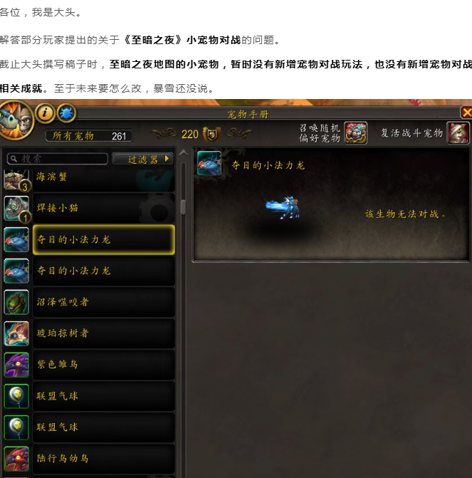 魔兽世界:《至暗之夜》小宠物对战暂无新增,新地图右键点选丢笼即可捕获