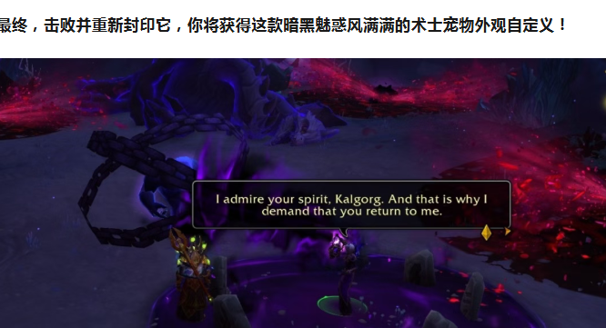 在任务中,你将与虚空精灵术士露西亚·破夜者联手,对抗她失控的虚空行者 Kalgorg。