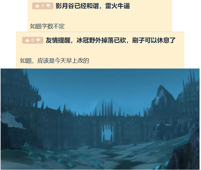 而就在12月12日到一次暗改下,野外刷子的天也塌了。目前实测下,外域的影月谷和诺森德的冰冠冰川这些刷子比较密集的地区,野外小怪的掉落都全部砍掉了。