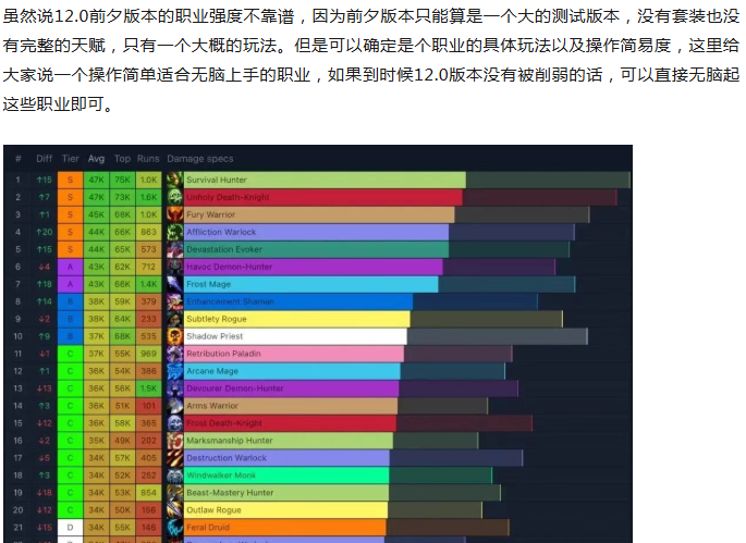 不出意外的话冰法将会是12.0版本最大的黑马职业,这里并不是说强度,而是操作难度,有点像之前的惩戒骑和黑箭兽王猎,只要12.0版本冰法的强度保持在A级,那么就完全够用了,绝对是一个大火的专精。改版前的冰法技能多到两排放不下,12.0前夕之后删了一半技能,操作都可以赶上怀旧服模式了,大部分时间在复读寒冰箭,至于强度的话可以稳定在A级。