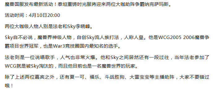 魔兽国服发布时光服最新活动!Sky和法老都来助阵了